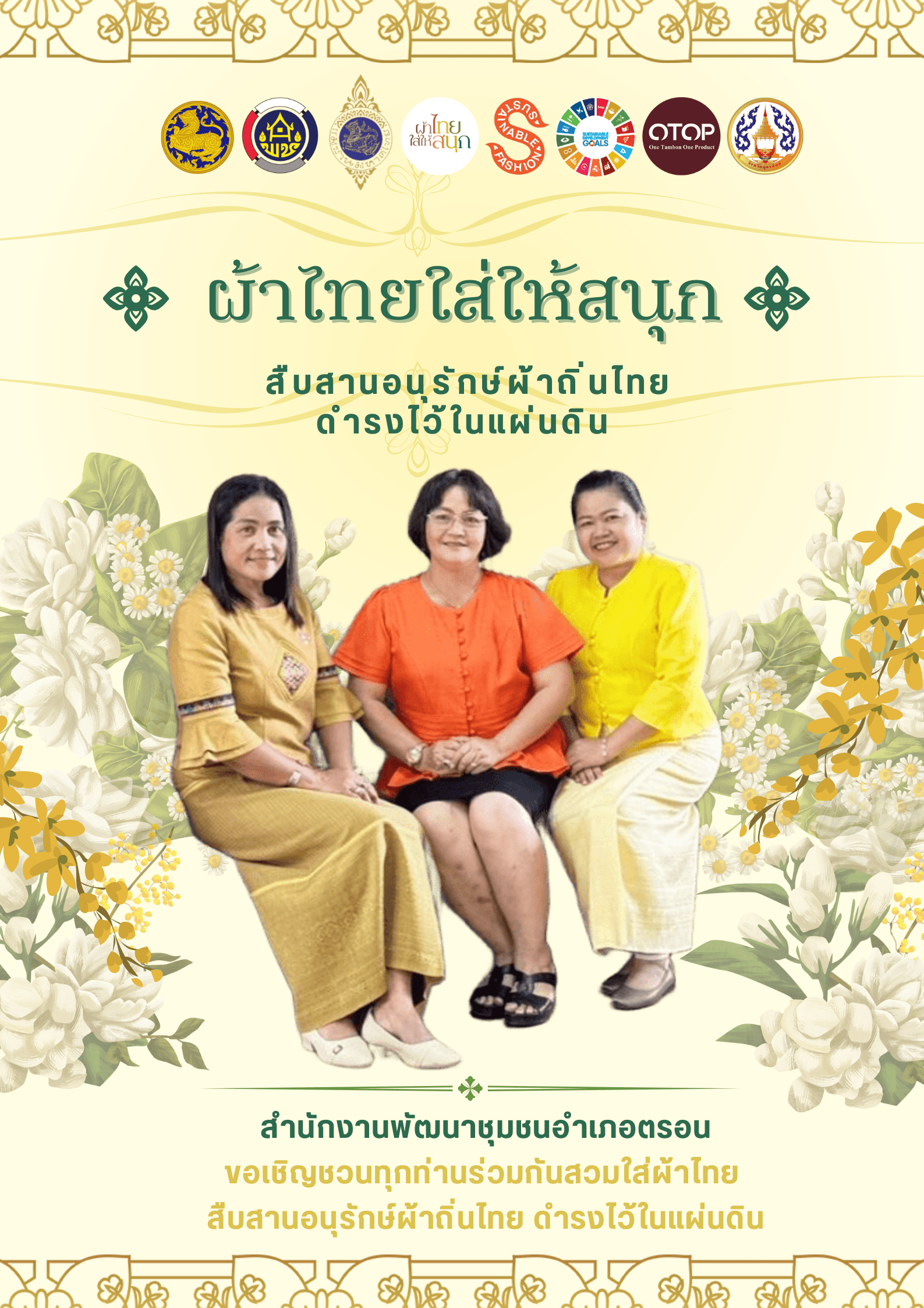 สำนักงานพัฒนาชุมชนอำเภอตรอน ขอเชิญชวนทุกท่านสวมใส่ผ้าไทย เพื่อสนับสนุนผลิตภัณฑ์ผ้าไทยและเชิดชูเอกลักษณ์วัฒนธรรมการสวมใส่ผ้าไทยให้แพร่หลาย ตลอดจนร่วมอนุรักษ์และส่งเสริมภูมิปัญญาผ้าไทยให้ธำรงอยู่คู่ชาติไทยสืบไป และสร้างรายได้ให้กับกลุ่มอาชีพ/ผู้ประกอบการ OTOP 🎀