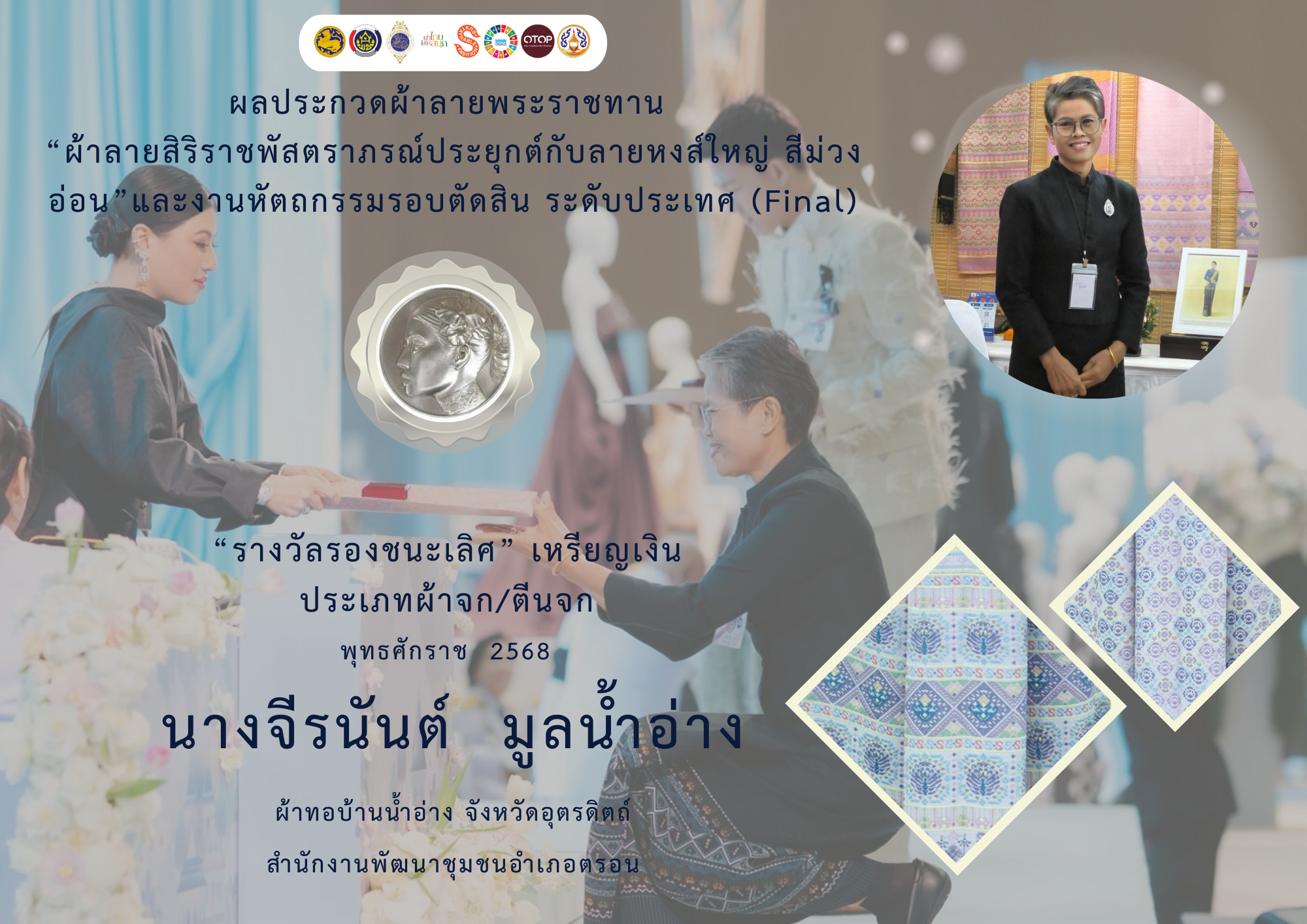 พช.ตรอน ยินดีกับ นางจีรนันต์ มูลน้ำอ่าง กลุ่มผ้าทอจากน้ำอ่าง อำเภอตรอน ได้รับรางวัลรองชนะเลิศ เหรียญเงิน ในการประกวดผ้าลายพระราชทาน "ผ้าลายสิริราชพัสตราภรณ์" และงานหัตถกรรม รอบตัดสิน ระดับประเทศ (Final) ปี 2568 🎀
