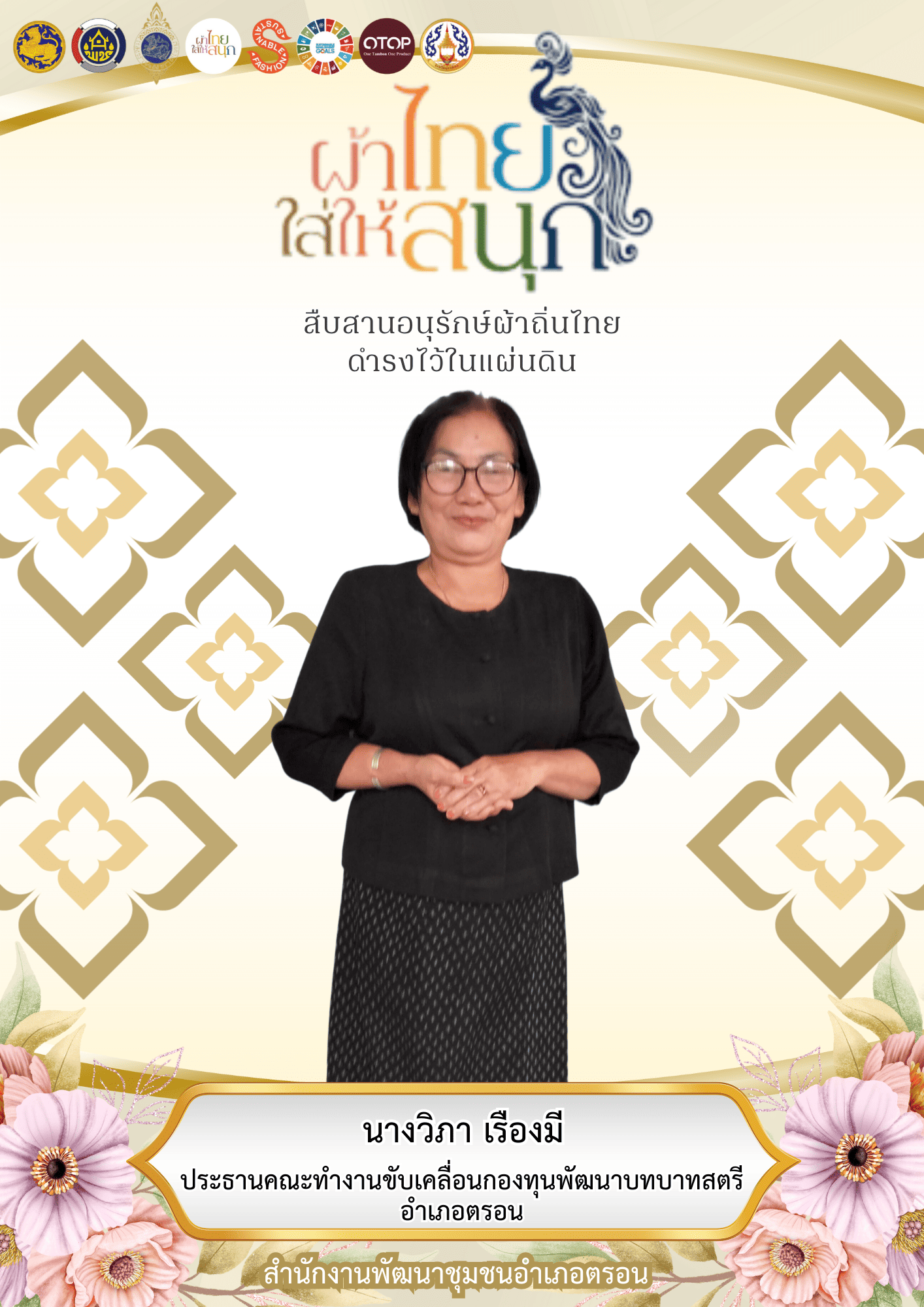 นางวิภา เรืองมี ประธานคณะทำงานขับเคลื่อนกองทุนพัฒนบทบาทสตรีอำเภอตรอน เพื่อสนับสนุนผลิตภัณฑ์ผ้าไทยและเชิดชูเอกลักษณ์วัฒนธรรมการสวมใส่ผ้าไทยให้แพร่หลาย ตลอดจนร่วมอนุรักษ์และส่งเสริมภูมิปัญญาผ้าไทยให้ธำรงอยู่คู่ชาติไทยสืบไป และสร้างรายได้ให้กับกลุ่มอาชีพ/ผู้ประกอบการ OTOP